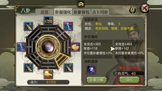 翻開妳的【八卦】→【卦盤強化】,選中任意壹個卦位,點擊【強化】卦位就能晉級。卦位強化晉級有必要耗費【靈氣】,能夠經過分化那些無用的卦象取得。      比如妳抽到的白色、綠色、藍色,或許替換下來的紫色卦象,放在包裏占空間,那不如分化!資源收回再利用,多環保又可持續發展。分化每個卦象能收獲多少靈氣如下表所示。